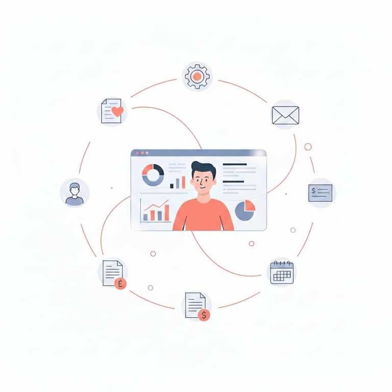 Intégrations fluides entre vos outils (emails, devis, factures, site web, réseaux sociaux…).